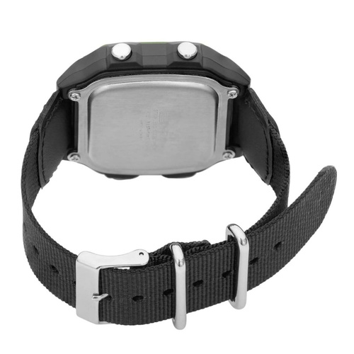 طراحی این ساعت، مثل یک داشبورد هواپیمای قدیمی اما مدرن! قاب رزین مشکی با قطر 44.2 میلیمتر و ضخامت 13.6 میلیمتر، حس محکمی میده بدون اینکه دستت رو خسته کنه. صفحه دیجیتال با سه بخش مجزا: یکی برای زمان محلی، یکی نقشه جهان که با زمان فعلی همگام میشه، و یکی دیگه برای نمایش زمان خانه. دکمههای جانبی بزرگ و فلزی، تنظیم رو آسون میکنن، و LED نور کهرباییش در تاریکی، همه چیز رو روشن میکنه. بند پارچهای مشکی هم ضدعرقه و قابل تنظیم، طوری که حتی تو دویدن یا کوهنوردی، اذیت نمیکنه. از این رو، اگر استایل کژوال یا تاکتیکال دوست داری، این طراحی قلبت رو میبره.