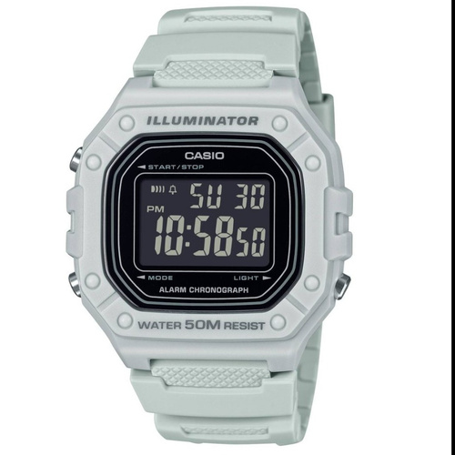 کاسیو W-218H-8BVDF با بدنه و بند رزین خاکستری روشن عرضه میشود که در نور طبیعی کمی به سمت سبز-خاکستری متمایل است. بنابراین اگر به دنبال ساعتی هستید که از رنگهای تکراری مشکی و سفید فاصله بگیرد، این مدل انتخاب هوشمندانهای است. قاب هشتضلعی کلاسیک کاسیو با چهار پیچ فلزی در گوشهها، ظاهری صنعتی و مقاوم به آن بخشیده و دکمههای جانبی بزرگ، تنظیم سریع را ممکن میکنند.